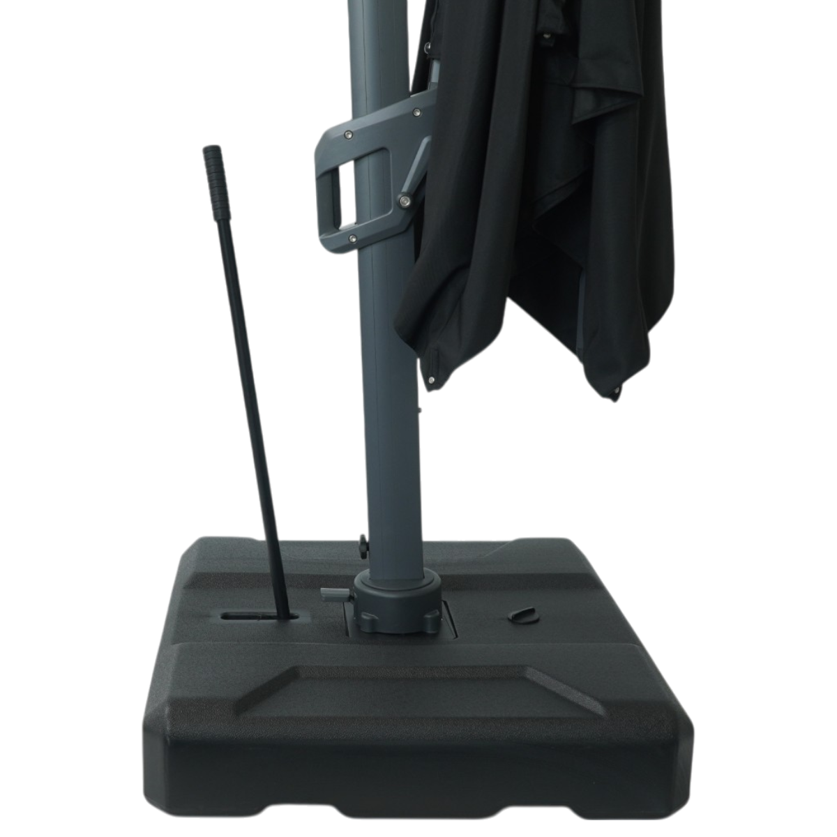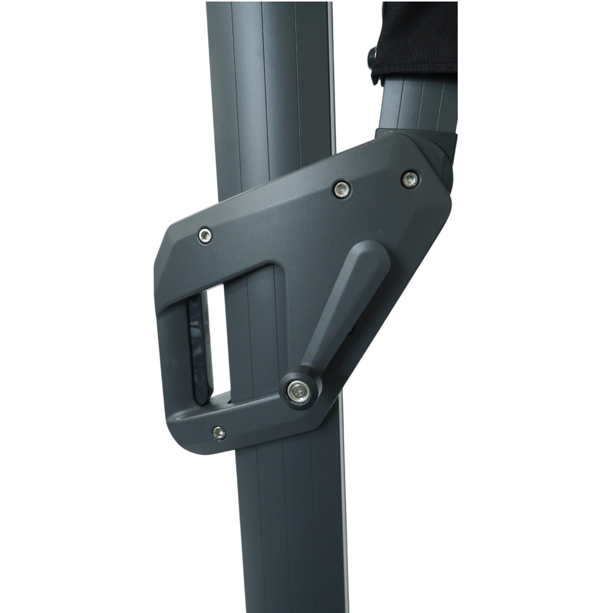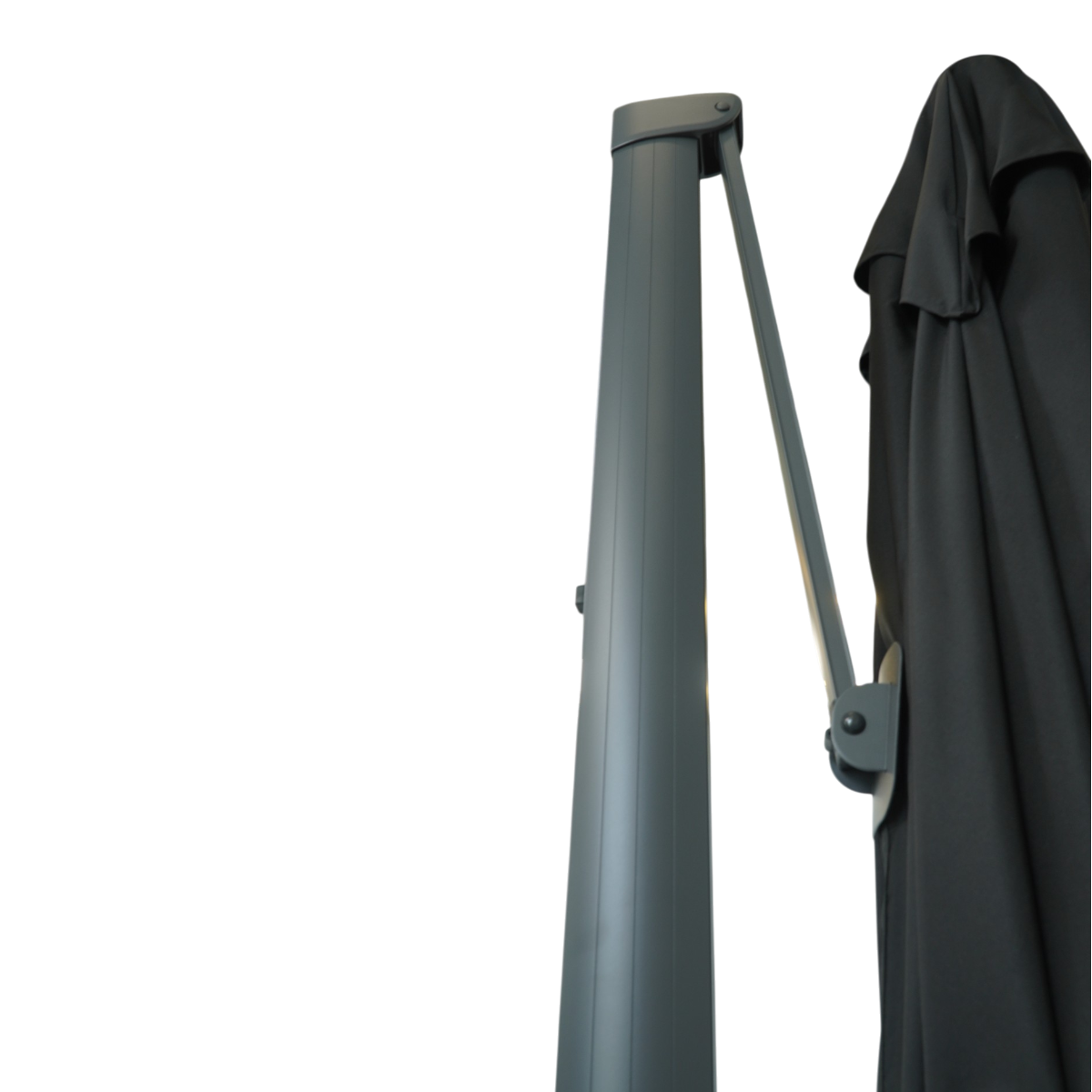 Med en bredde på hele 3×3 meter dækker parasollen nemt større arealer og skaber komfortable skyggeområder til dine gæster. Det fritstående design med sidearm (også kendt som hængearm) sikrer, at hele arealet under parasollen kan udnyttes optimalt – uden generende midterstang.
