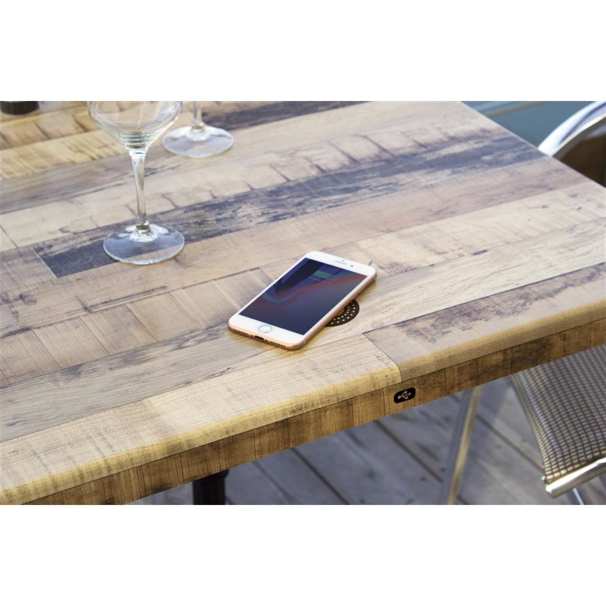 Bordskiva med inbyggd trådlös laddning för smartphones. Telefonen placeras bara på den integrerade telefonplaceringssymbolen. Denna typ av bordskiva är extra motståndskraftig mot vind och väder, vilket gör den särskilt lämplig för utomhusbruk, men kan naturligtvis också användas inomhus. Den är dessutom lätt att rengöra.