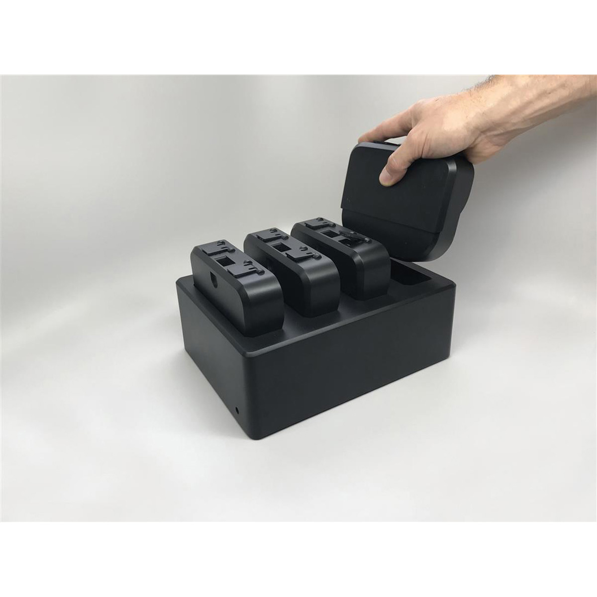 Laddare för 4 batterier och säkerhetsnyckel för trådlös laddare för smartphones, som kan byggas in i vissa bordsskivor. Obs Batterier ingår inte.