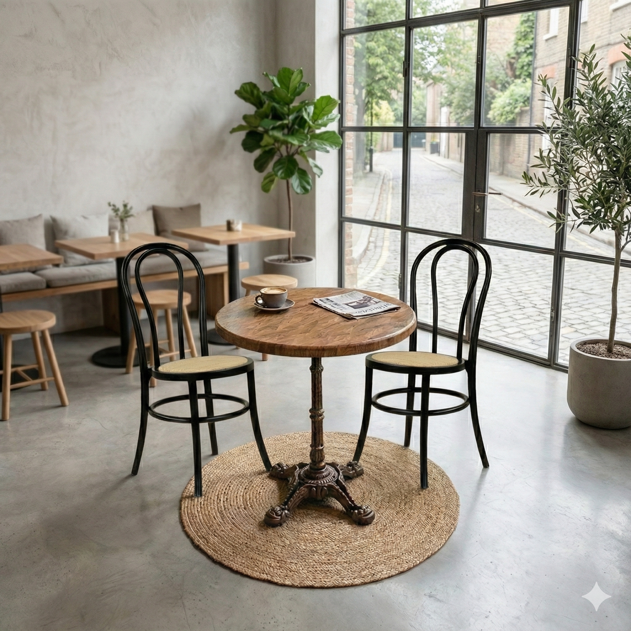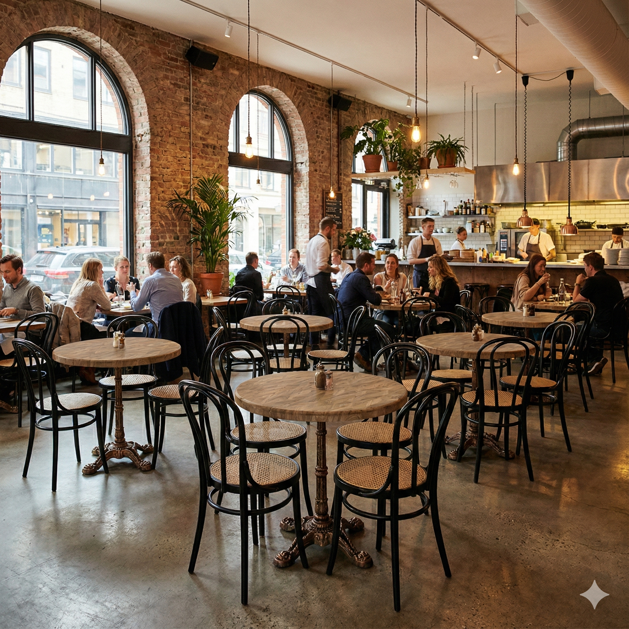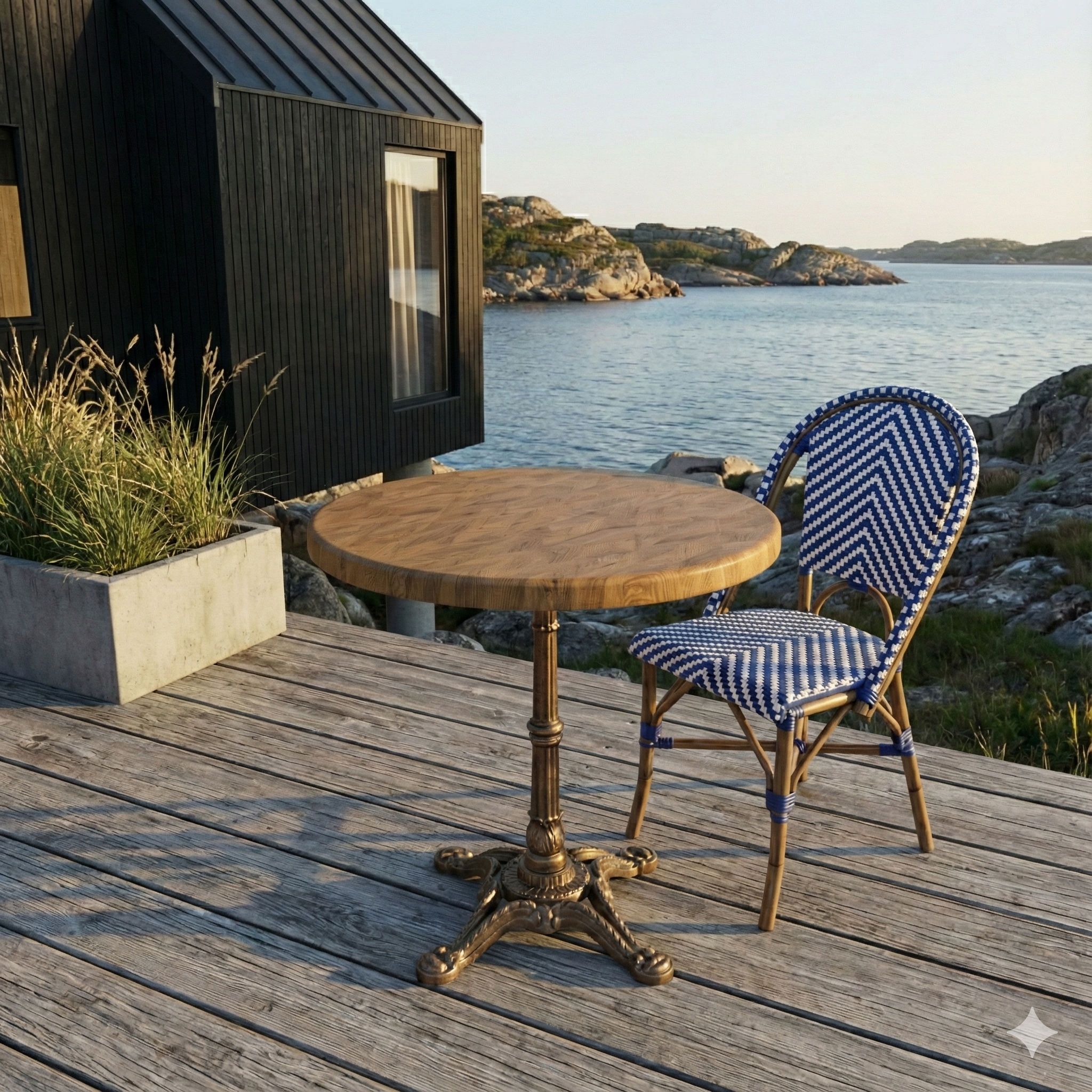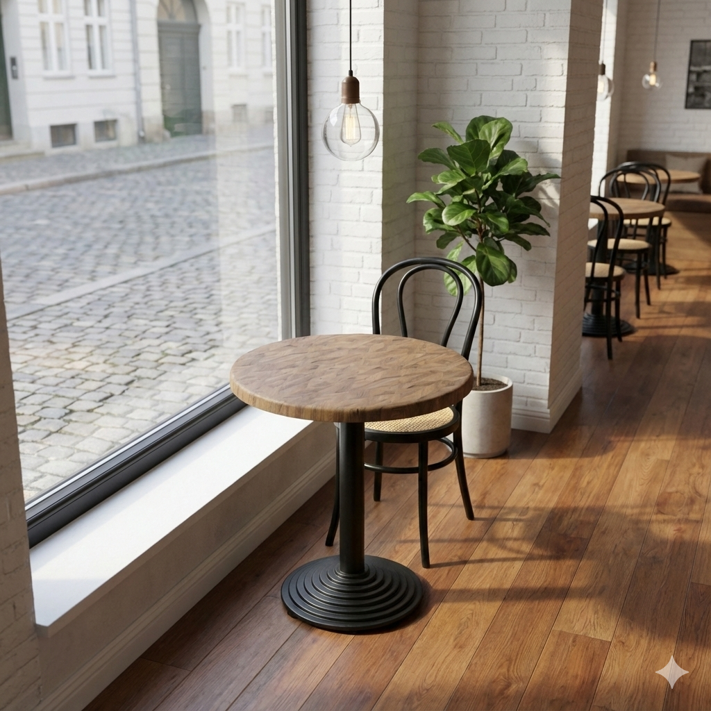 Den runda formen stödjer en flexibel och social borduppställning, som bidrar till en behaglig gästupplevelse och effektiv utnyttjande av platsen. En driftsäker lösning för professionella, som önskar ett ljust träutseende med låg underhåll och lång livslängd – både inomhus och utomhus.