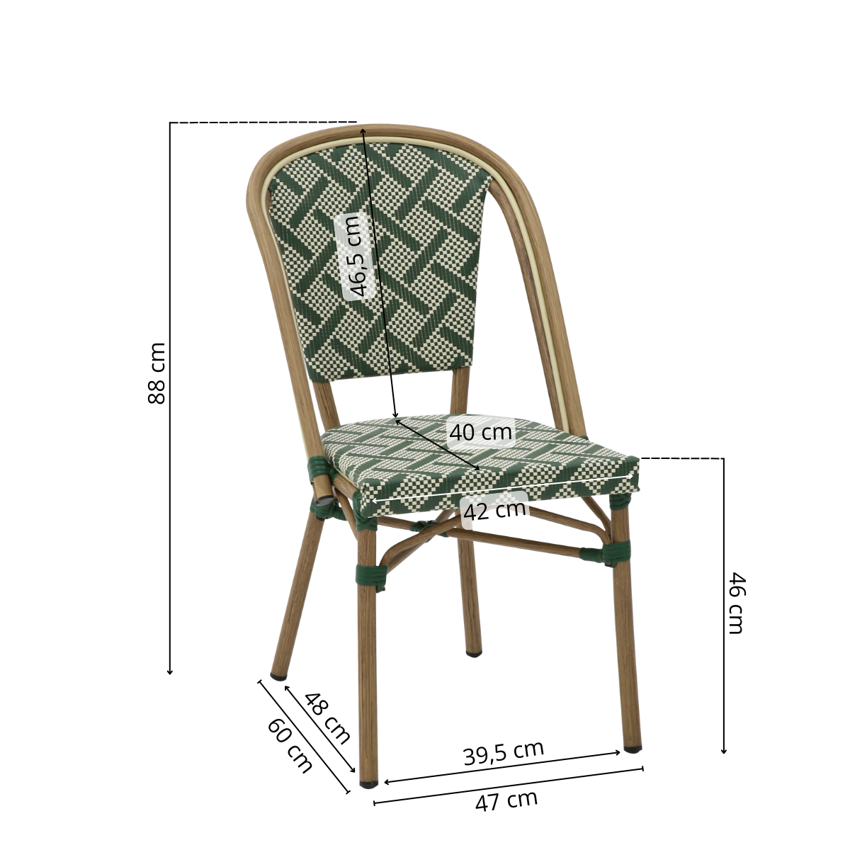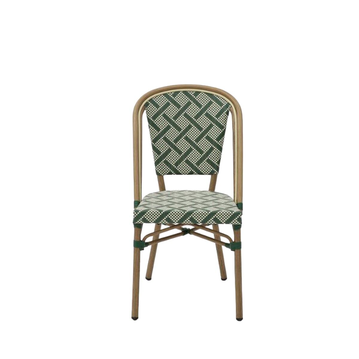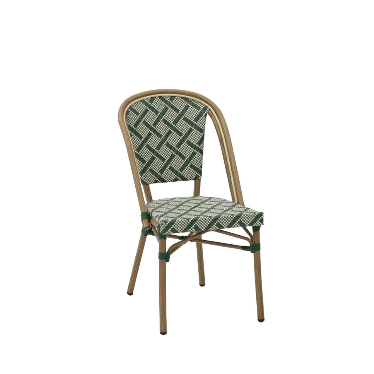 Metz Caféstol i textylene kombinerer klassisk fransk bistrodesign med moderne materialer, der gør den ideel til professionelle miljøer som caféer, restauranter, hoteller og udeserveringer. Med sit iøjnefaldende grøn- og hvidmønstrede flet og bambuslignende aluminiumsstel giver Metz-stolen både charme og praktisk værdi.