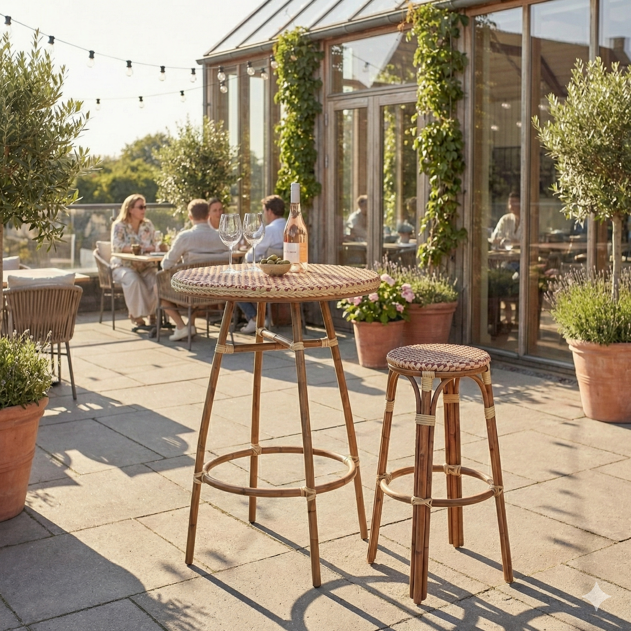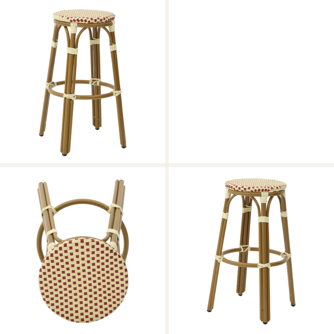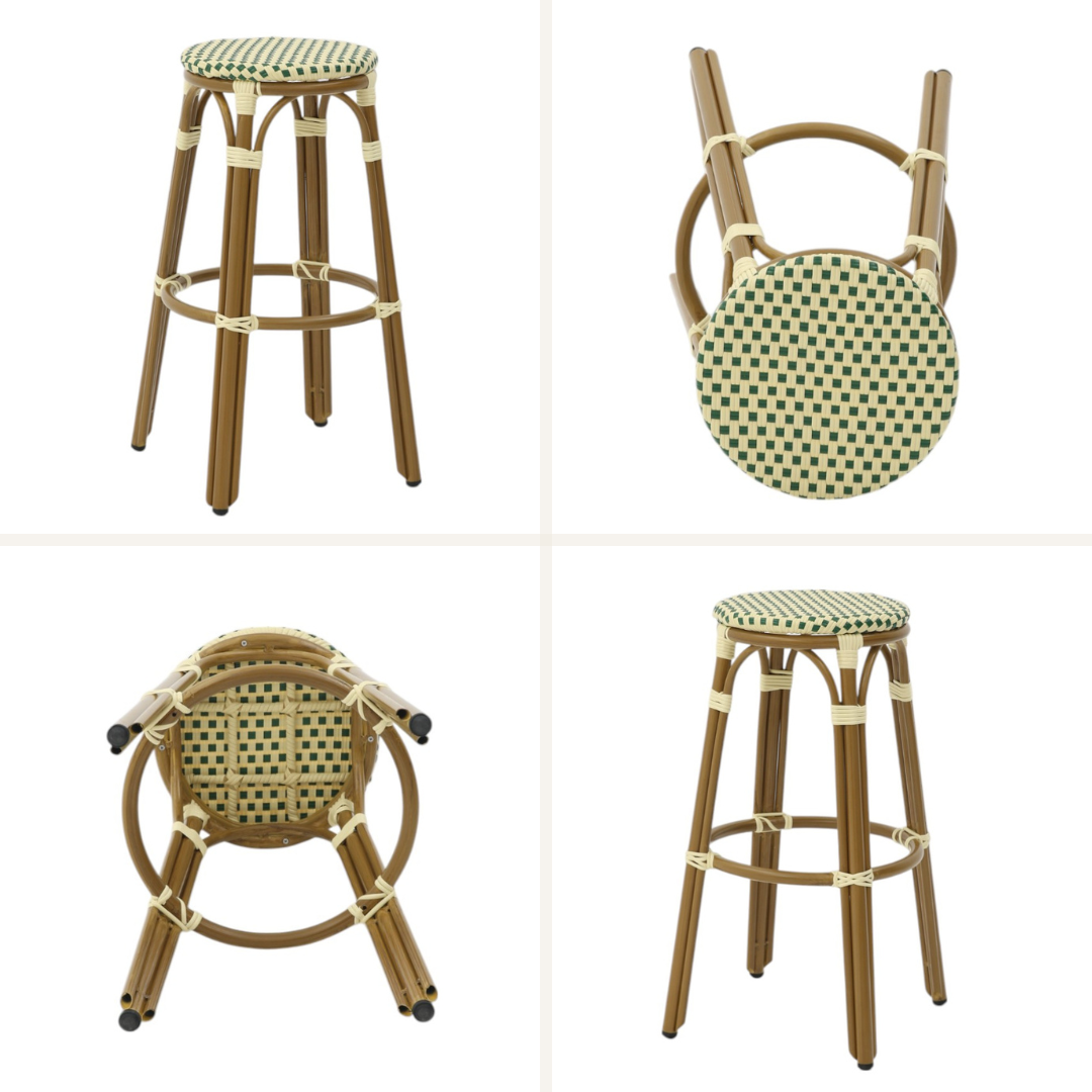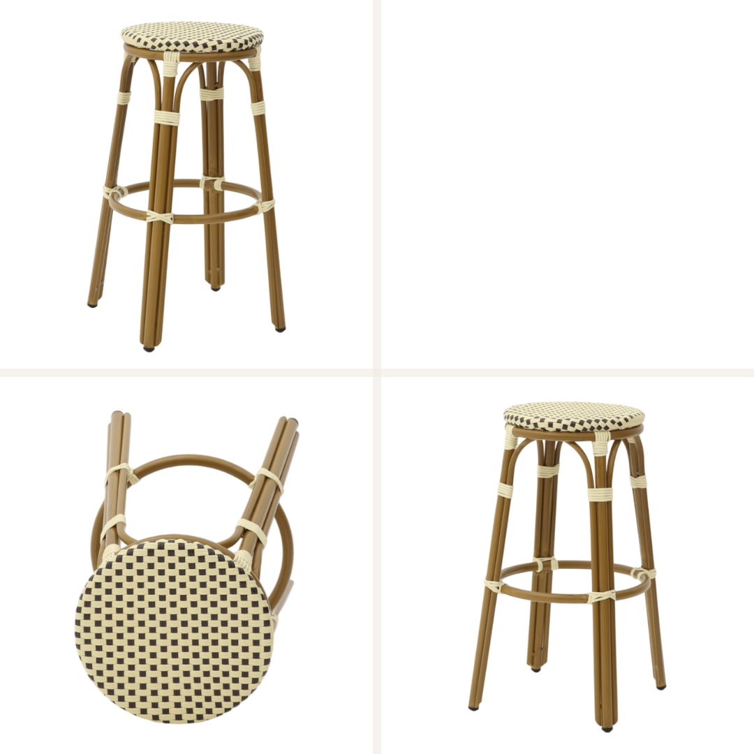 - Klassisk franskt design: Den flätade sitsen i polyrattan och eleganta aluminiumramar i bambulook ger en sofistikerad, parisisk atmosfär till din inredning.