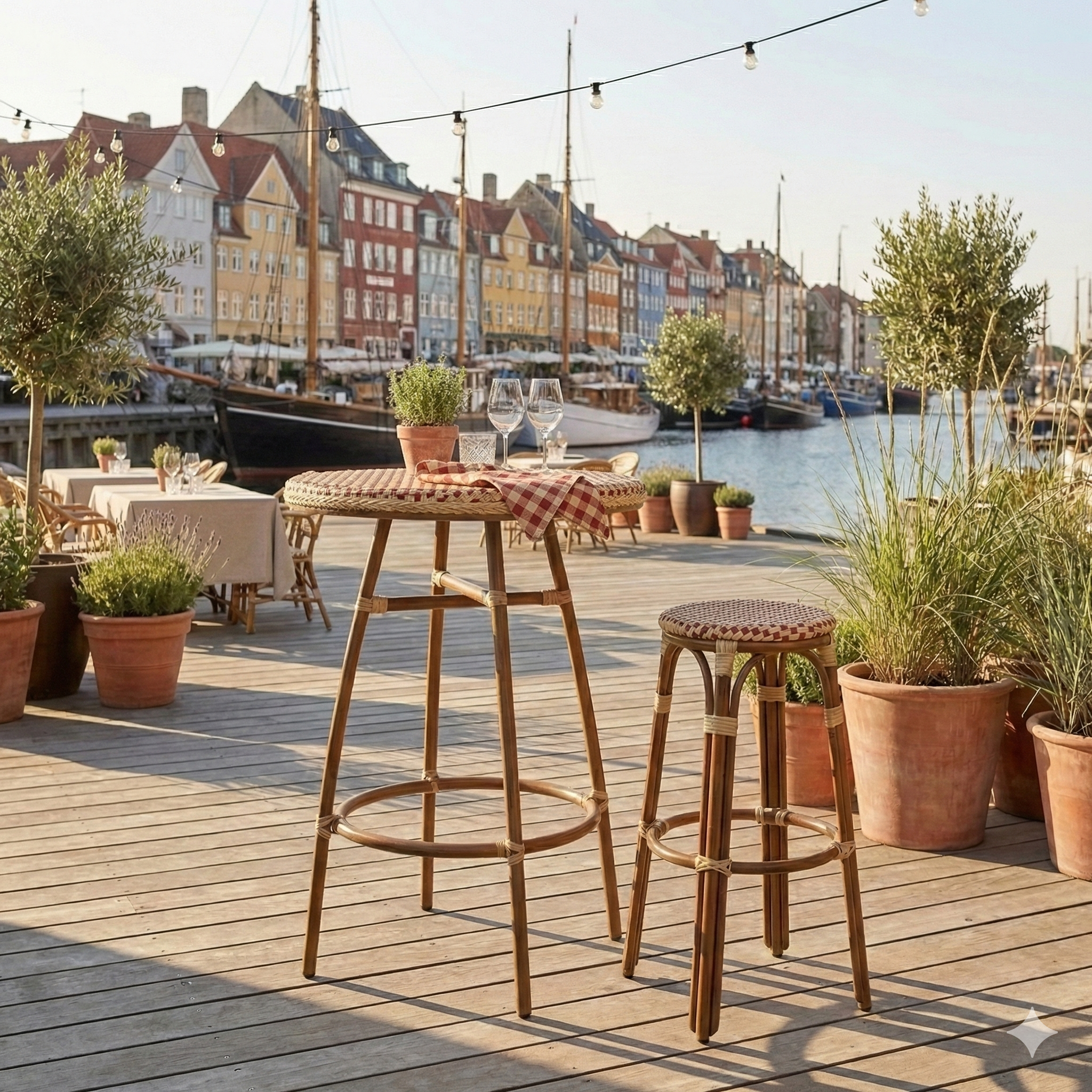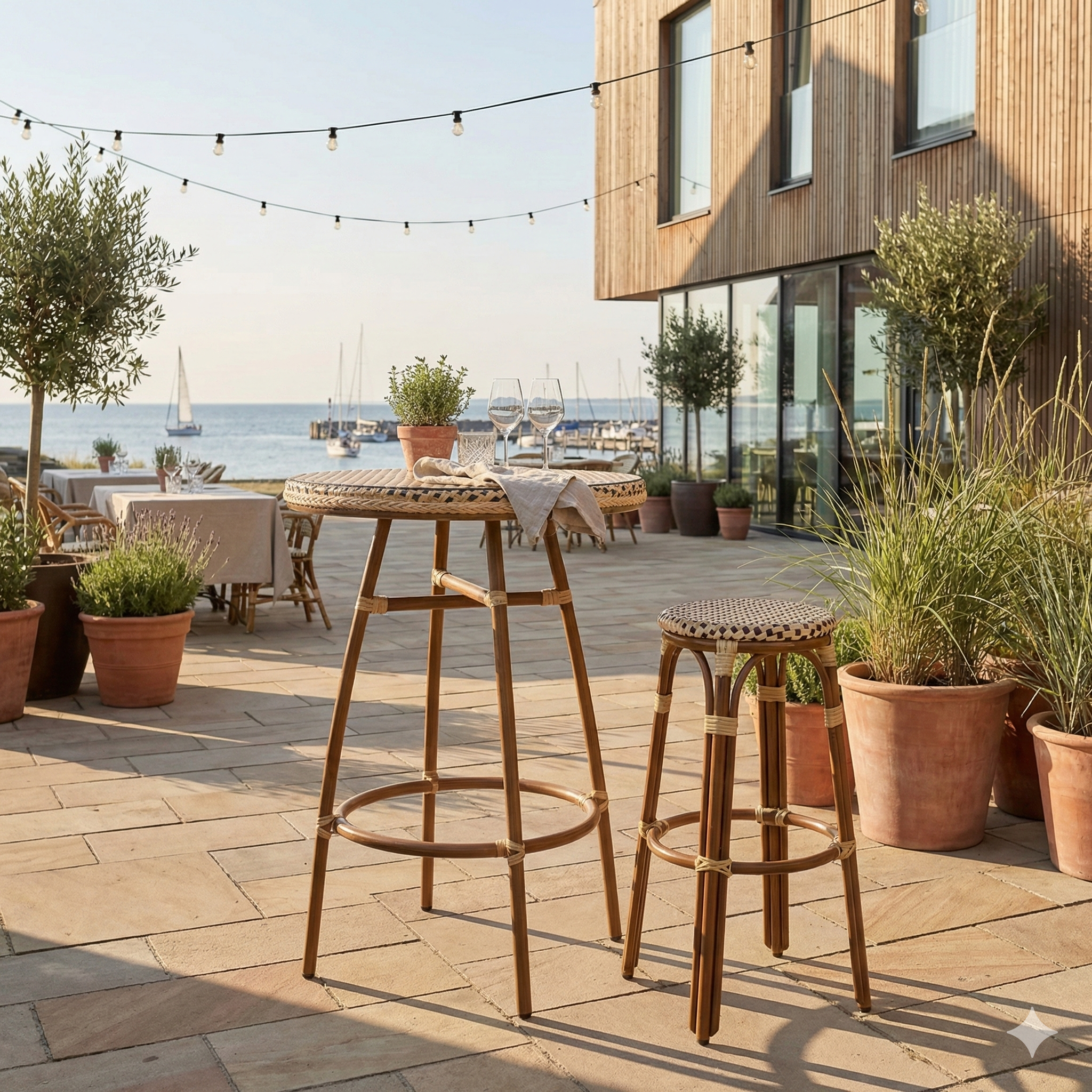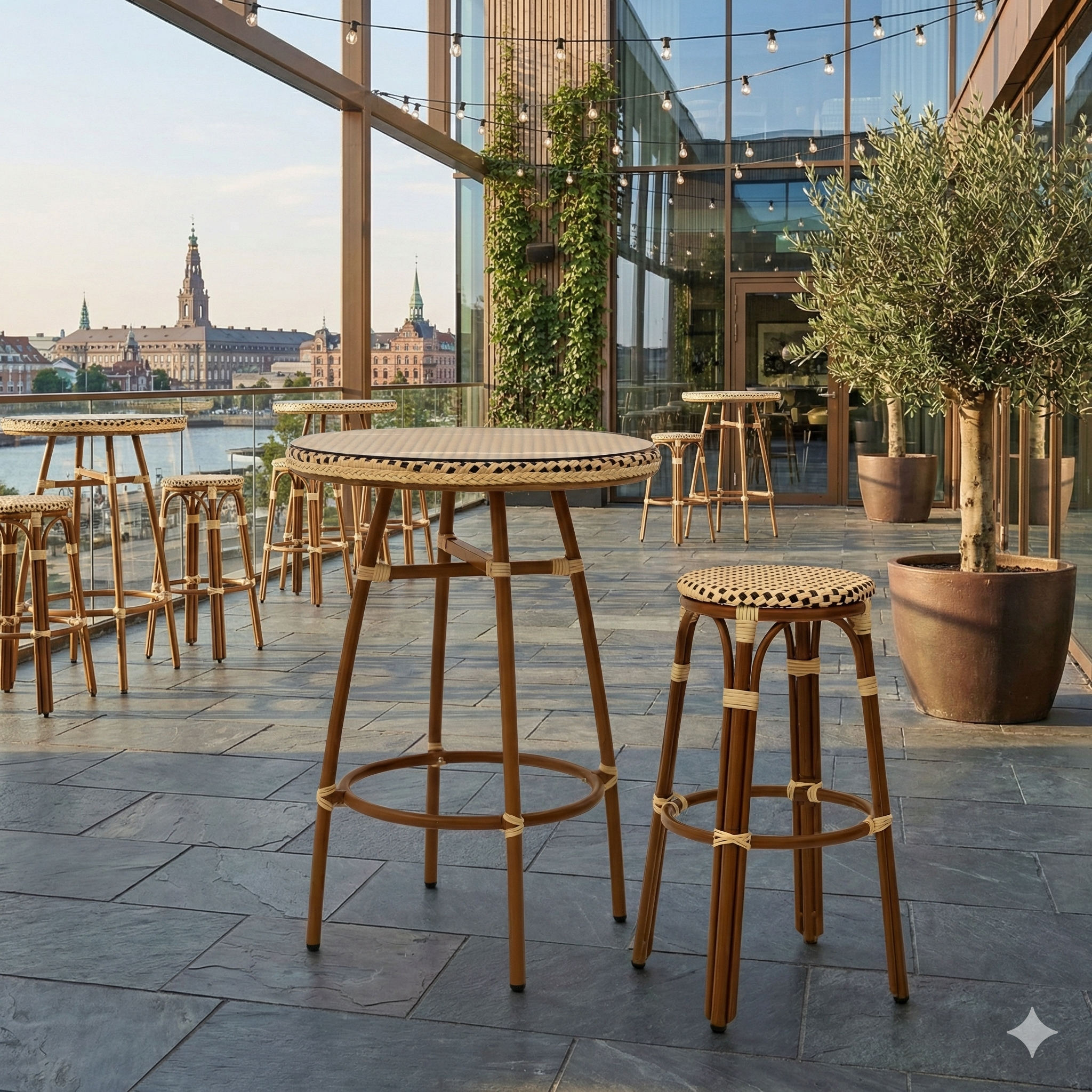 - Klassisk franskt design: Den flätade sitsen i polyrattan och eleganta aluminiumramar i bambulook ger en sofistikerad, parisisk atmosfär till din inredning.