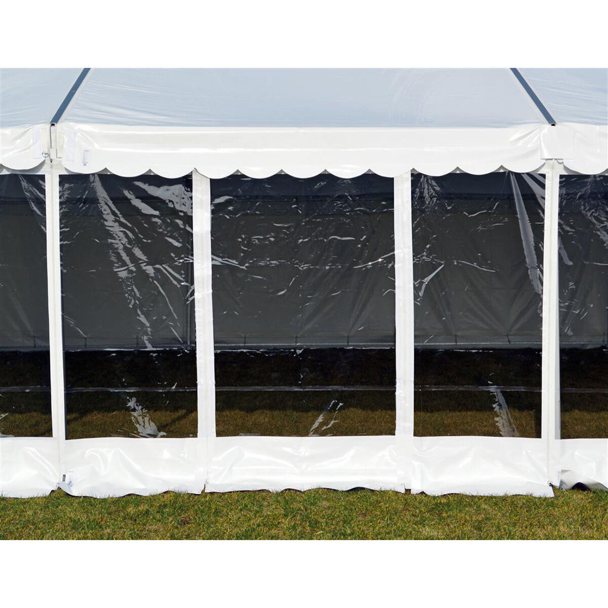 Kraftig sidoduk med panorama, dörr och hål för partytält. Väljer du många sidodukar med fönster får du in mycket ljus i ditt tält och riktigt bra utsikt. Om du kombinerar sidodukar med och utan fönster kan du skapa ytor i tältet där det inte finns insyn eller där solen inte skiner direkt in. Det kan vara en fördel i samband med en buffé eller en bar. När du använder en panoramaduk är det viktigt att den hanteras på rätt sätt. Panoramaduk som har legat ett tag klibbar ihop och om den viks ut i kallt tillstånd finns det risk att duken spricker eller går sönder på annat sätt. Duken bör förvaras i en temperatur på 22 grader. Celsius i minst 3 timmar innan du sträcker, annars riskerar du att skada den klara PVC-en. Skador på panoramaduk som inte hanteras eller förvaras korrekt betraktas inte som reklamation. Vi rekommenderar att duken inte viks, utan förvaras på rullar.