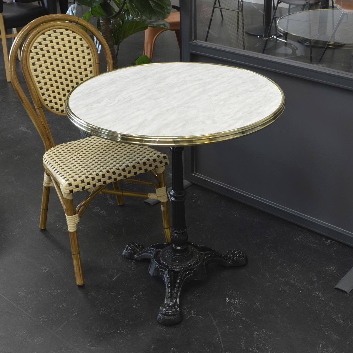 Denna typ av bordskiva är extra motståndskraftig mot vind och väder, vilket gör den särskilt lämplig för utomhusbruk, men kan naturligtvis också användas inomhus. Den är dessutom lätt att rengöra. Var dock uppmärksam på att mässingskanten kräver putsning med mässingsrengöring/putsmedel minst en gång i månaden.